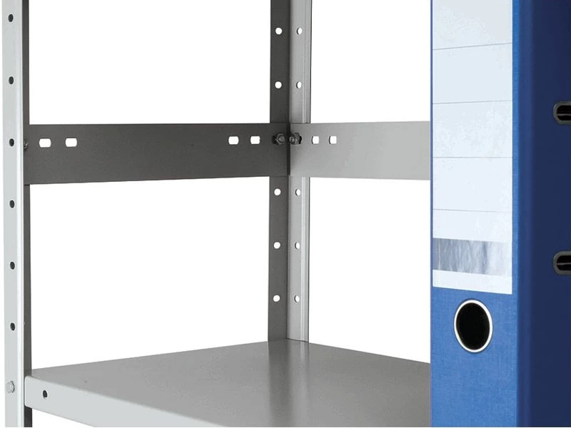 Овальная двухсторонняя перфорация позволяет с лёгкостью собрать или демонтировать стеллаж. Собирается при помощи болтов (без гаек). Многоярусная конструкция стеллажа позволяет максимально рационально использовать занимаемое пространство и обеспечивает удобный доступ к предметам, находящимся на полках. Стеллажи можно скреплять между собой.